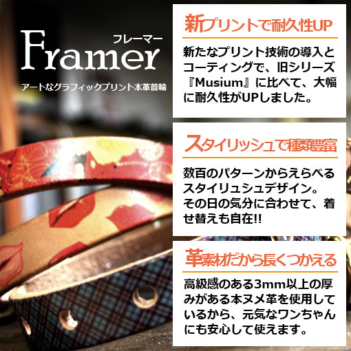 Framer アートなグラフィック本革首輪 大正着物柄 真鍮無垢金具 サイズSS~L ベルト幅16mm #23488 Framer
