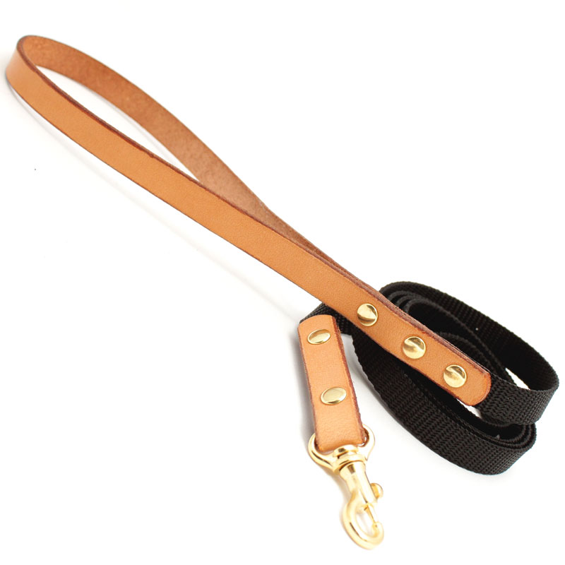 黒色青海波紋様リード 真鍮製ナスカン 小・中・大型犬用16/24mm幅 持ち手ヌメ革 A2683 リード・引き綱