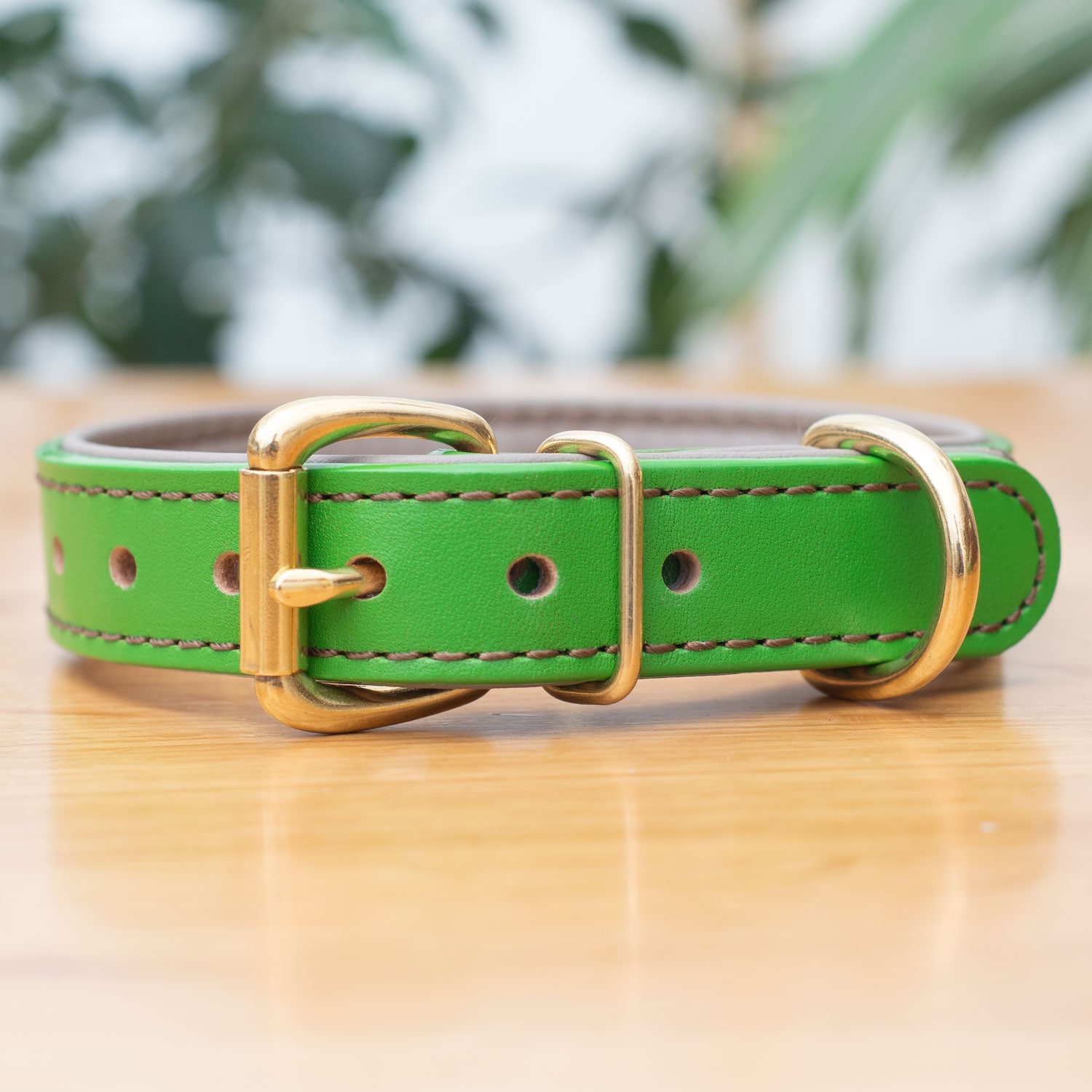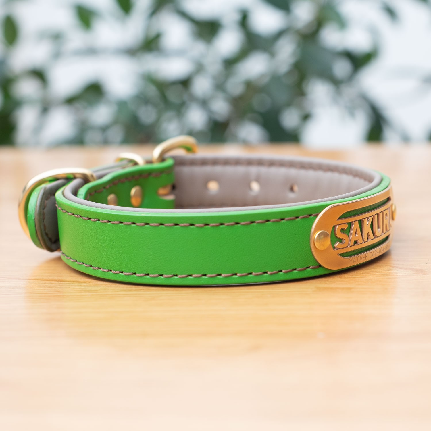 プレートは通常の約1.2倍厚みで、がっちり固定。電話番号まで刻印できるため、迷子札を別でぶら下げる必要がありません。真鍮も革も、使い込むほどに艶と深みが増し、愛犬と一緒に育てる首輪に。