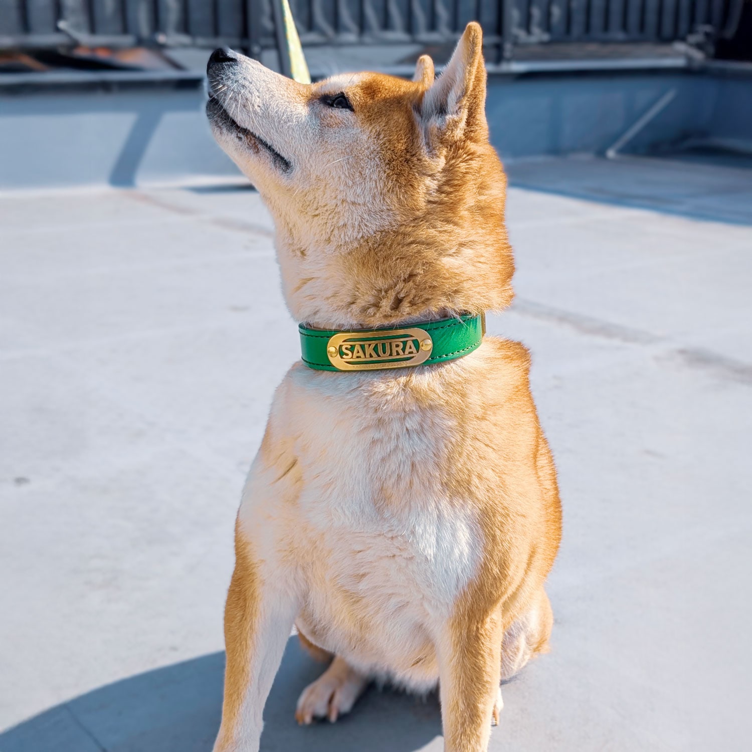 H.B.ワイド本革首輪に、真鍮無垢から削り出す立体彫刻ネームプレートを標準装備。