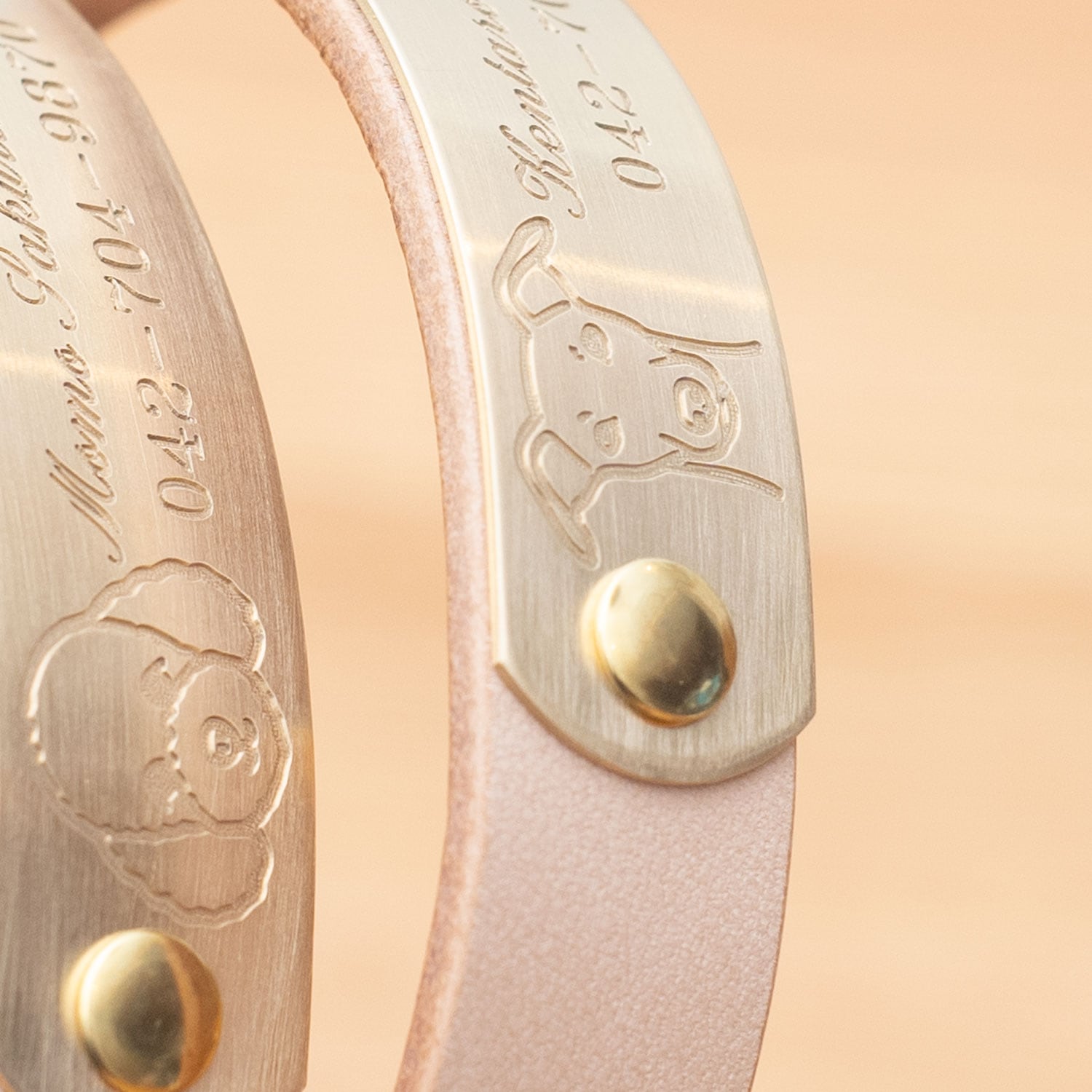 生成りのヌメ革ベルトに、切削彫刻の真鍮プレートを組み合わせた首輪です。