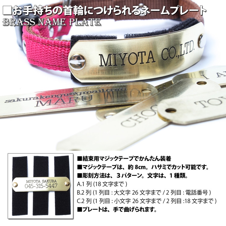 本革首輪・おしゃれ首輪・迷子札首輪の サクラ犬具製作所 / 持っている首輪にかんたん装着 セミオーダー迷子札 SAKURA DOGWARE 名前・電話番号彫刻 真鍮無垢プレート(プレート素材/USA製) | 首輪,おなまえ首輪 | | サクラ犬具製作所